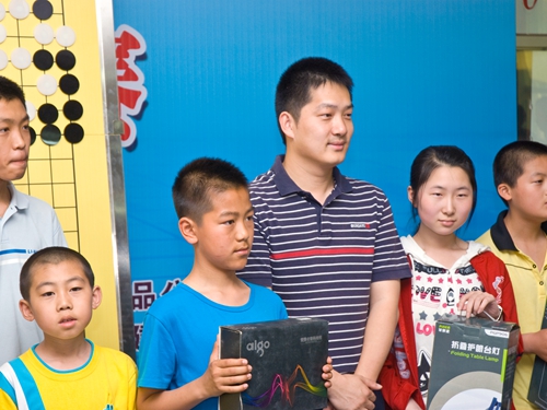 光临本市的世界冠军常昊九段为方圆小棋手颁奖